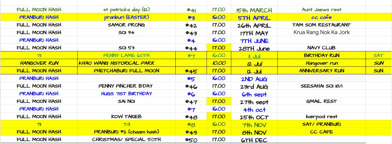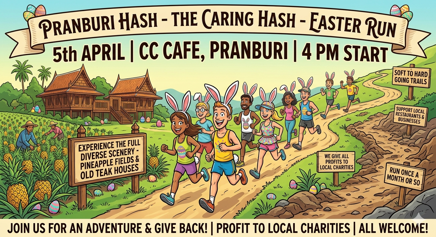 Pranburi Sunday Hash House Harriers runs & schedule: weekly Sunday trail runs and walks around Pranburi and Hua Hin for all levels. Check start location, hares, runners and walkers trails, and the on‑on restaurant.